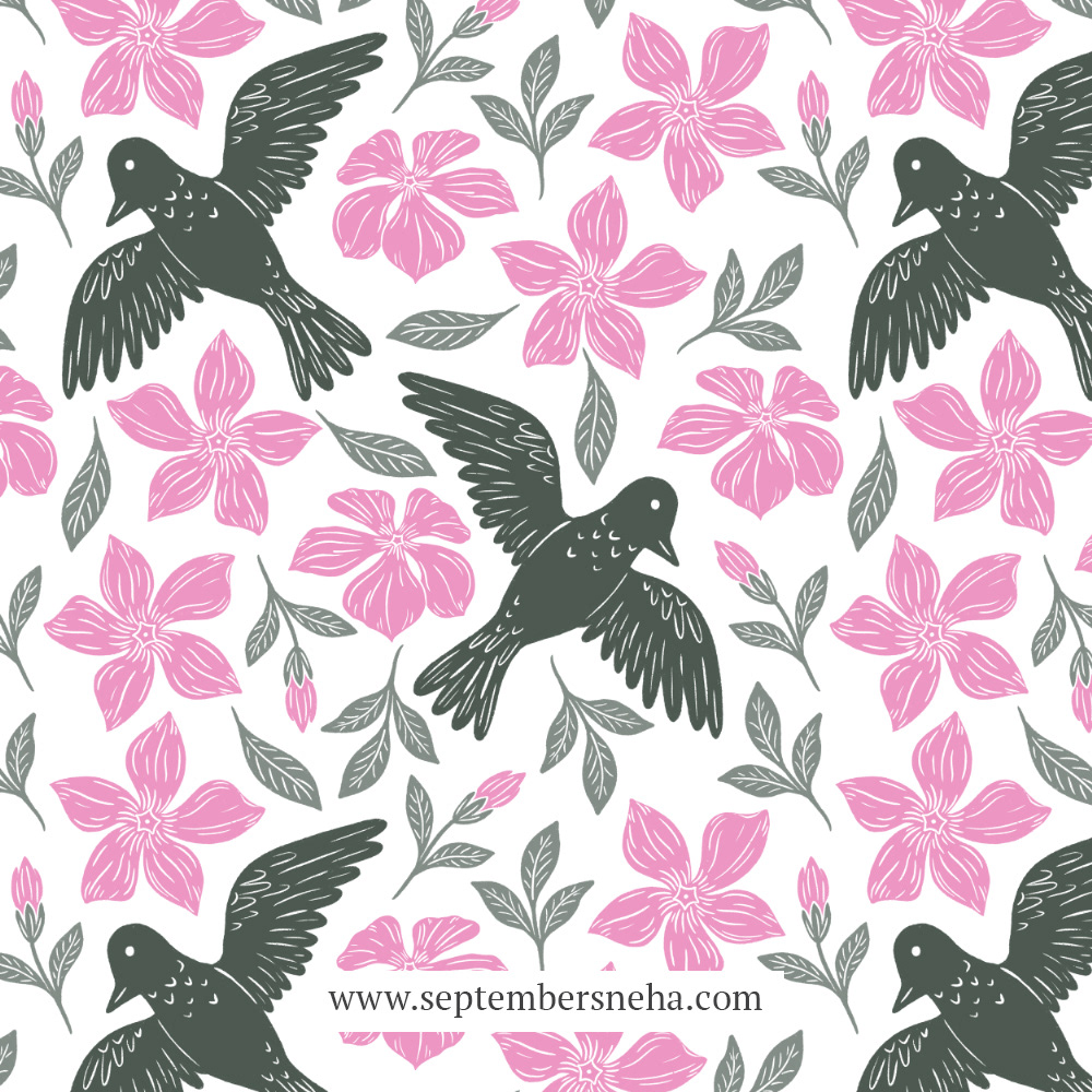 Pink & Purple Periwinkles with green birds seamless pattern. SKU0101 Size 12in x 12in
